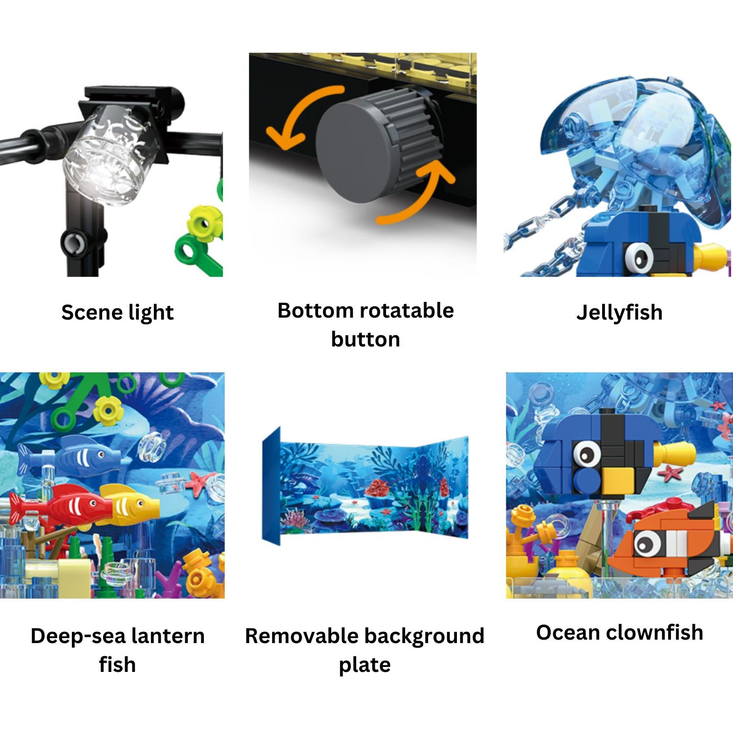 - Set Includes: Equipped with marine life, jellyfish, algae, ocean clownfish, scene lights, detachable background panels, and rotating lower knob to control the turtles, this set offers endless possibilities for customization and creativity.